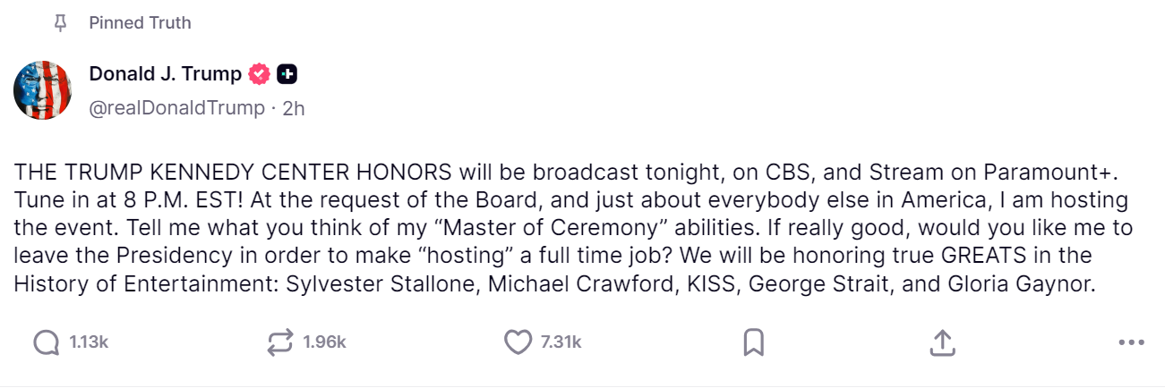 "Церемония награждения в Центре Трампа и Кеннеди будет транслироваться сегодня вечером на канале CBS и в режиме онлайн на Paramount+. Смотрите в 20:00 по восточному времени! По просьбе Совета директоров и практически всех остальных в Америке я буду ведущим этого мероприятия. Скажите, что вы думаете о моих способностях «ведущего церемонии». Если они действительно хороши, хотели бы вы, чтобы я покинул пост президента, чтобы сделать «ведение церемонии» своей основной работой? Мы будем чествовать настоящих ВЕЛИКИХ деятелей в истории развлечений: Сильвестра Сталлоне, Майкла Кроуфорда, KISS, Джорджа Стрейта и Глорию Гейнор."