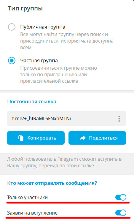 Как это сделать? Нужно в настройках группы поменять тип группы на "Частная", и включить опции (по умолчанию они выключены) "Только участники" и "Заявки на вступление".