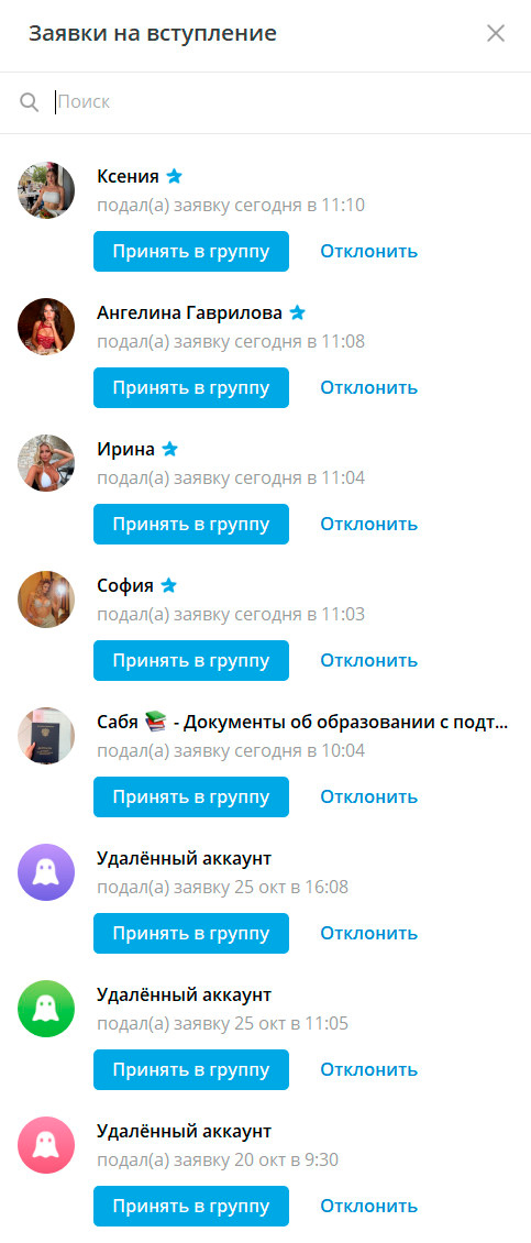 И когда администратор щелкает по ссылке, то он видит что-то вот такое. В данном случае это актуальные запросы в группу моего телеграм-канала, которые поступили за последние пару часов. И здесь все заявки - сплошной спам, ставки на спорт и шлюхботы.