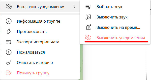Но вторая проблема решается элементарно. Сначала у группы (чата) нужно выключить уведомления: нажать на меню справа сверху, в разделе уведомлений выбрать "Выключить уведомления".
