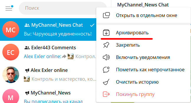 После этого на самой группе нажать правую кнопку мыши, и в контекстном меню выбрать "Архивировать" - чат будет перенесен в архив, и так как уведомления у него выключены, он не появится из архива при добавлении в него новых сообщений.
