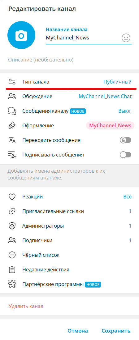Нажимаете "Создать группу", даете ей какое-то название, после этого открывается окно с данными созданного канала. И вот там есть один очень важный момент - тип канала.