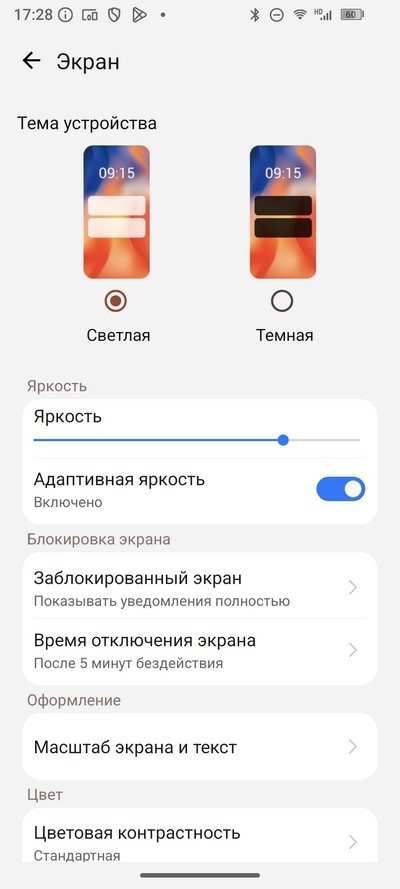 Настройки экрана - стандартные для Android. Есть темный режим, режим чтения, можно настраивать размер шрифта и масштаб.