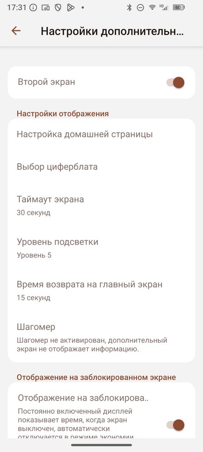 Также на дополнительном экране можно отображать шагомер и задавать отображение при заблокированном основном экране.