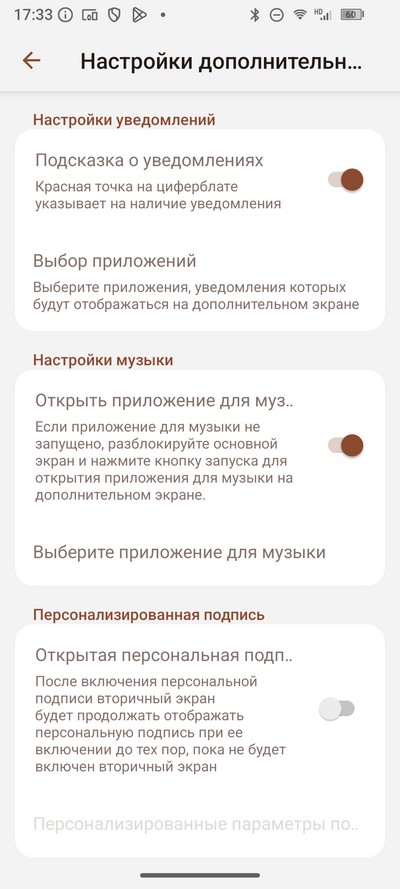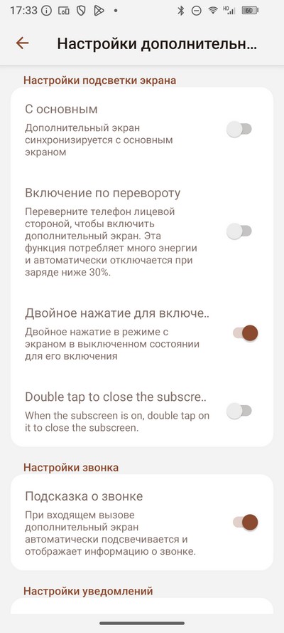 Настройки дополнительного экрана, расположенного на задней крышке.