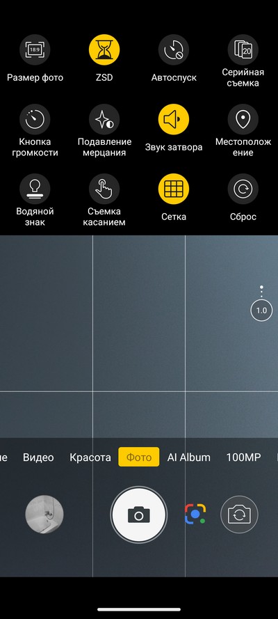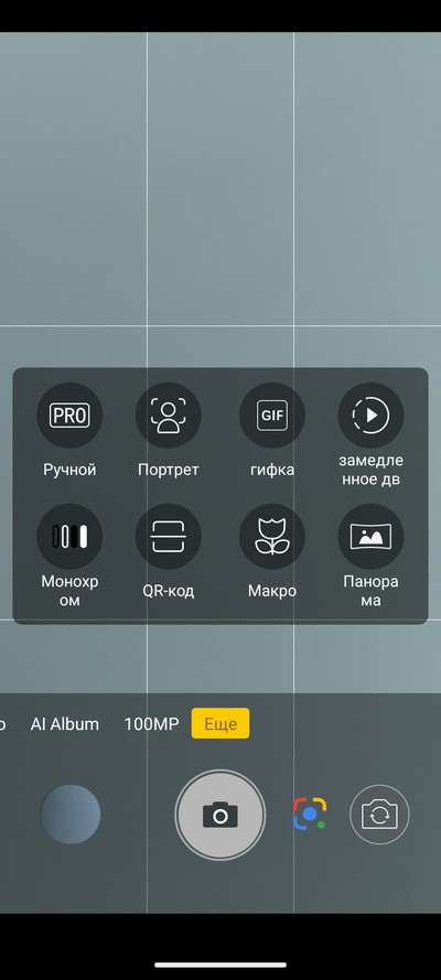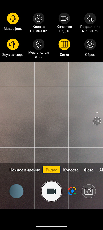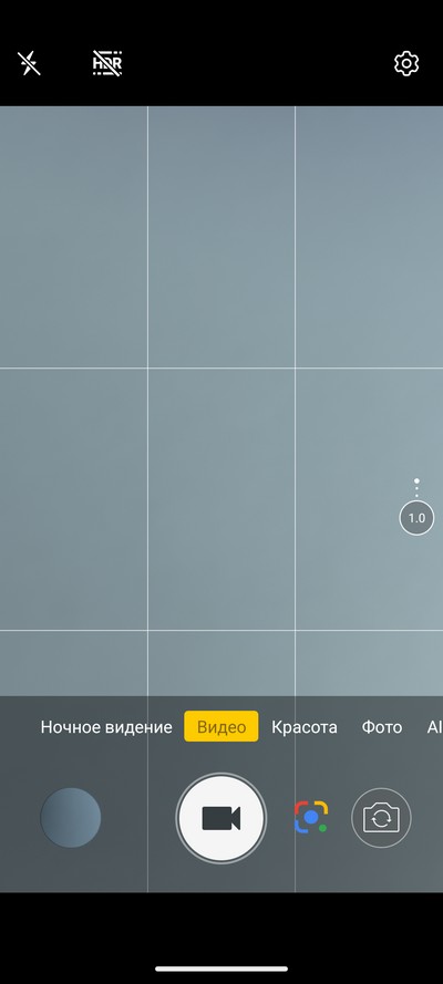 Интерфейс камеры. Снизу переключаются режимы съемки. Сверху - пиктограммы различных переключателей.  Также там вызывается дополнительное меню переключателей.
