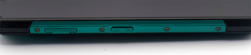 На левой грани - заглушка, под которой находится вставка для симкарт и карты памяти, также там находится еще одна управляющая "умная" кнопка, которая гибко настраивается.