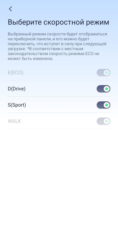 Режим Drive - самый комфортный с точки зрения динамики разгона, но здесь есть один недостаток: дело в том, что производитель зачем-то ограничил скорость режима Drive уровнем 20 км/ч. Мне не очень понятно, зачем это сделано. И почему пользователь не может задать максимальную скорость для данного режима. Потому что когда едешь по обычной автомобильной дороге (по тротуарам я и не езжу, это запрещено), то хочется все-таки иметь возможность набрать полную разрешенную скорость.