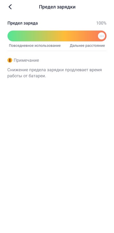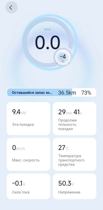Ну и окно с данными после тестовой поездки: уровень заряда аккумулятора, прогнозируемый километраж в зависимости от выбранного режима и другие параметры.