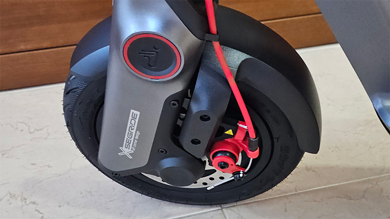 Передняя гидравлическая и задняя эластомерная подвеска для комфортной езды, а также 10-дюймовые бескамерные бесшумные колеса с гелевым слоем.
