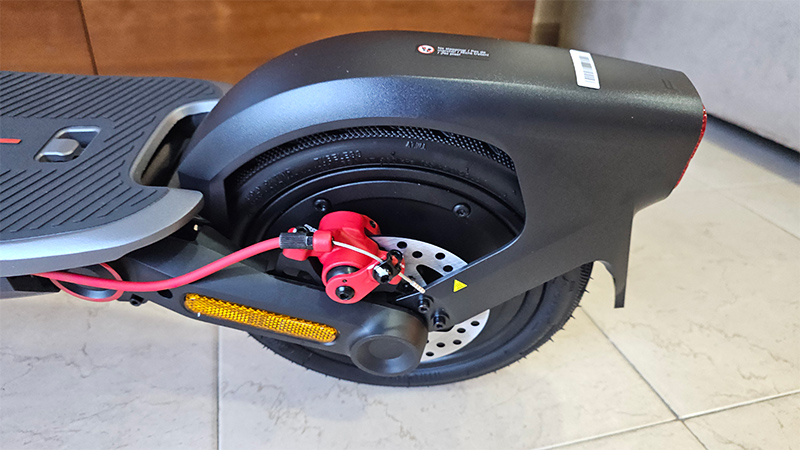 Заднее колесо с дисковым тормозом. Крыло над колесом жестко закреплено, и его нельзя использовать в качестве тормоза: производитель отдельно предупреждает, что на него нельзя вставать ногой.