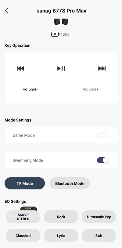 Приложение простенькое: там можно управлять плеером, включать игровой режим или режим плавания, переключать наушники с подключения по Bluetooth на автономный режим. Также там есть эквалайзер с предустановленными настройками, который заметно влияет на характер звучания наушников.