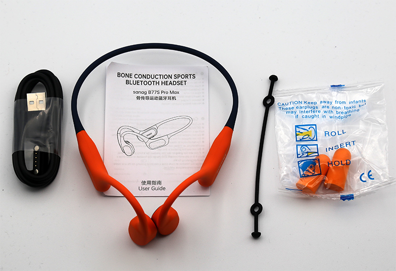Комплект поставки: наушники, кабель для зарядки, руководство пользователя, затычки для ушей, резиновая фиксационная перемычка для оголовья, чтобы наушники более плотно держались на голове.