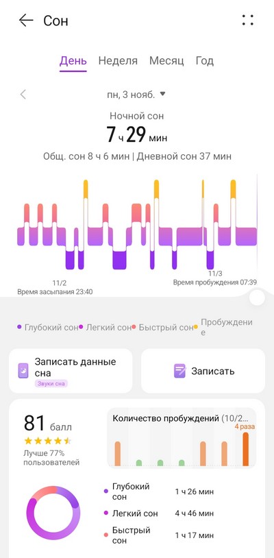 Мониторинг сна - как обычно у Huawei, просто отличный, и это лучший мониторинг из всех часов, что у меня были, Samsung там заметно отстает.