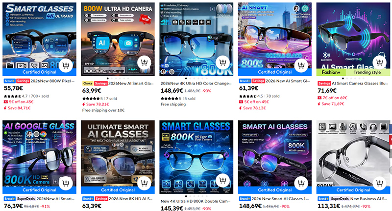 Так вот, у большинства продавцов сейчас предлагаются очки W630, которая обычно называется что-то вроде "2026New AI Smart Glasses 800W Pixel Camera", причем цены на них плавают от 50 до аж 150 евро, и это, судя по всему, одни и те же очки. И там предлагаются три варианта: фотохромы, которые темнеют на солнце, очки с защитой от синего спектра и черные очки.