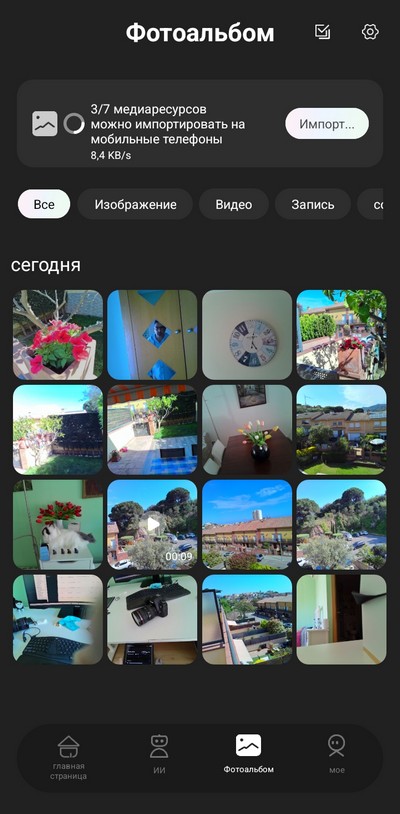Да, еще пара слов о том, как фото и видео работают со смартфоном. В разделе "Фотоальбом" показываются снятые фото и видео, когда появляется что-то новое, приложение предлагает это импортировать с очков. Причем это делается достаточно быстро - через WiFi. Полученные кадры и ролики можно загружать в фотоальбом смартфона (правый скриншот).