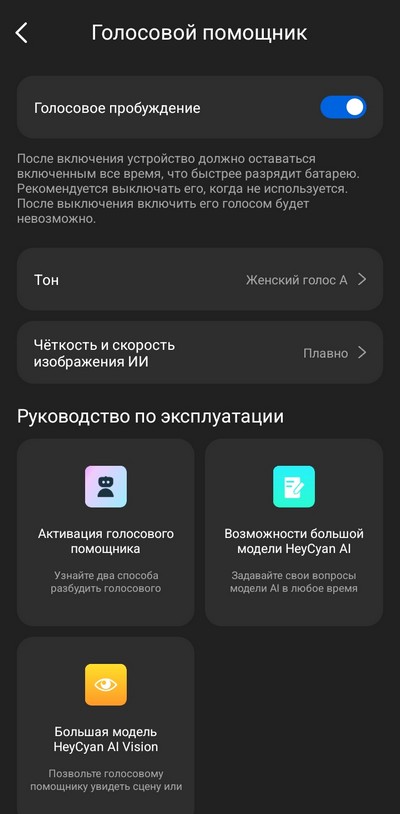 Настройки голосового помощника. Работает помощник, кстати, очень неплохо, только уж очень говорливый.