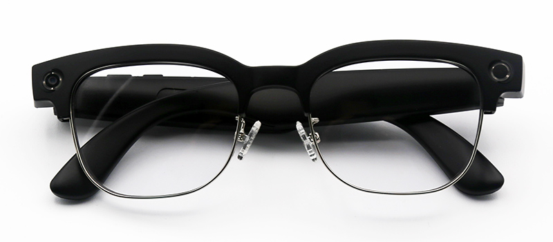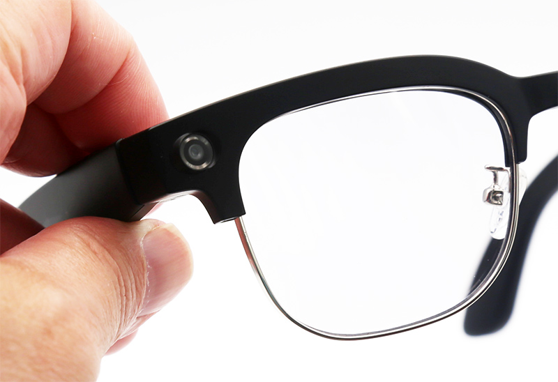 Очки в сложенном виде. Слева виден глазок камеры, справа - светодиод, который сигнализирует о съемке фото (белая вспышка) или видео (постоянно горящий белый светодиод).