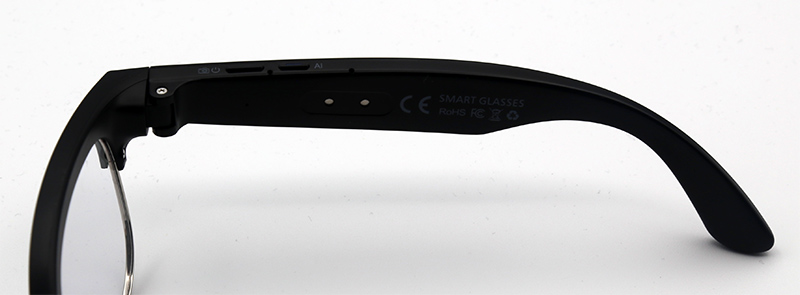 На правой дужке видны контакты для зарядки, левее расположен синий светодиод, который сигнализирует о включении очков и о их переходе в режим сопряжения.
