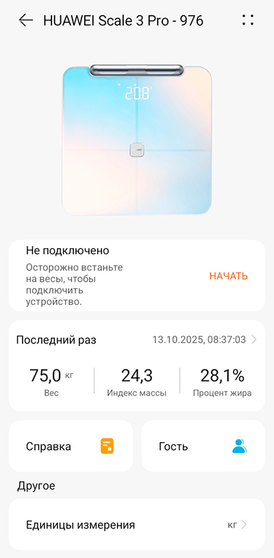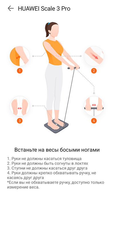 Страница весов в приложении Huawei Health. Инструкция по правильному выполнению измерений.
