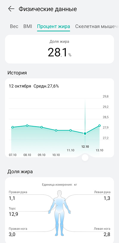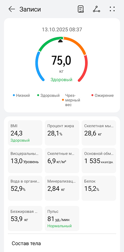 Данные, полученные с умных весов, показывают подробный состав тела, массу, процент жира, мышечную массу и другие параметры на 13 октября 2025 года. Вес составляет 75 кг, что находится в диапазоне "здорового" веса.
