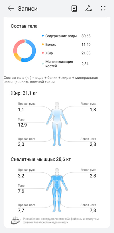 - Мышцы: Всего — 28,6 кг, распределение: руки (2,8–3,2 кг), туловище — 7,6 кг, ноги (7,3–7,7 кг).