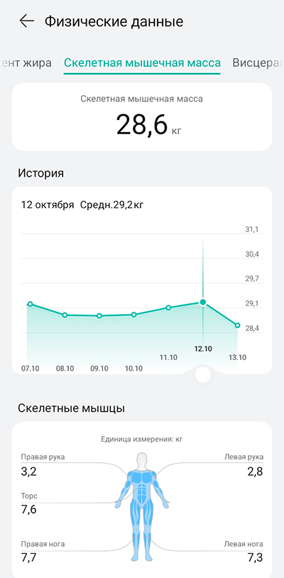 Скелетные мышцы: 28,6 кг (6,9 кг/м²) — довольно хороший показатель для поддержания метаболизма и физической формы.
