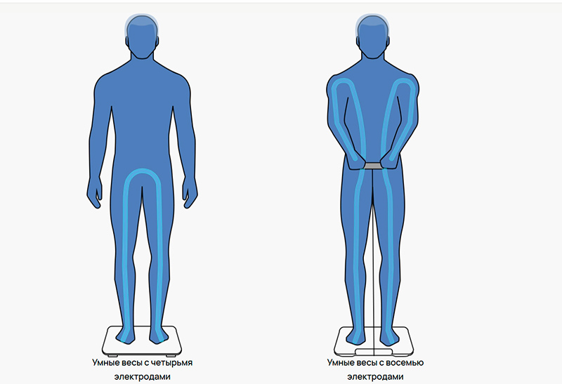 Что дает использование 8 датчиков вместо 4? Большую точность. Когда вы встаете на стандартные весы, то с помощью четырех электродов измеряются данные нижней части тела, а затем с помощью алгоритмов вычисляются данные о проценте жира и мышечной и костной массе для всего тела. А при использовании восьми электродов измеряются данные верхней и нижней частей тела, что позволяет получать более точные показатели.