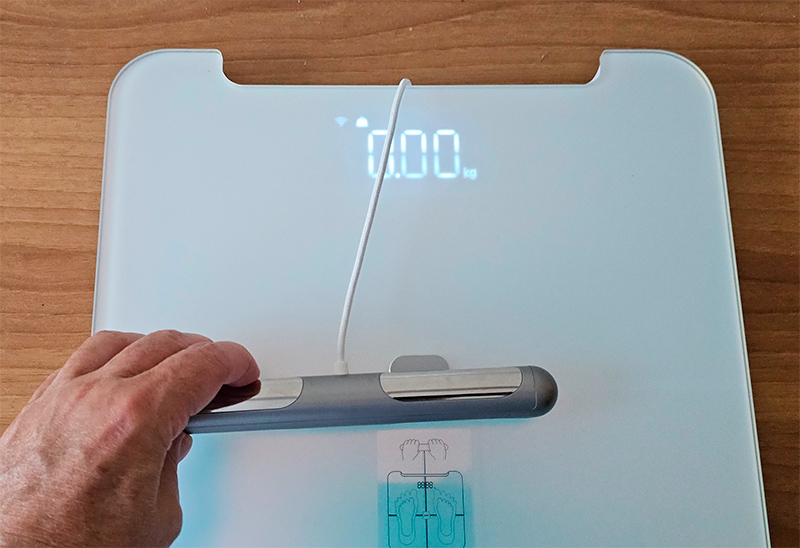 Ручка с четырьмя хромированными контактами выполнена из пластика, она снабжена выдвигающимся кевларовым кабелем: ее легко как вытягивать, так и возвращать на место, благодаря специальному механизму. К весам ручка примагничивается.
