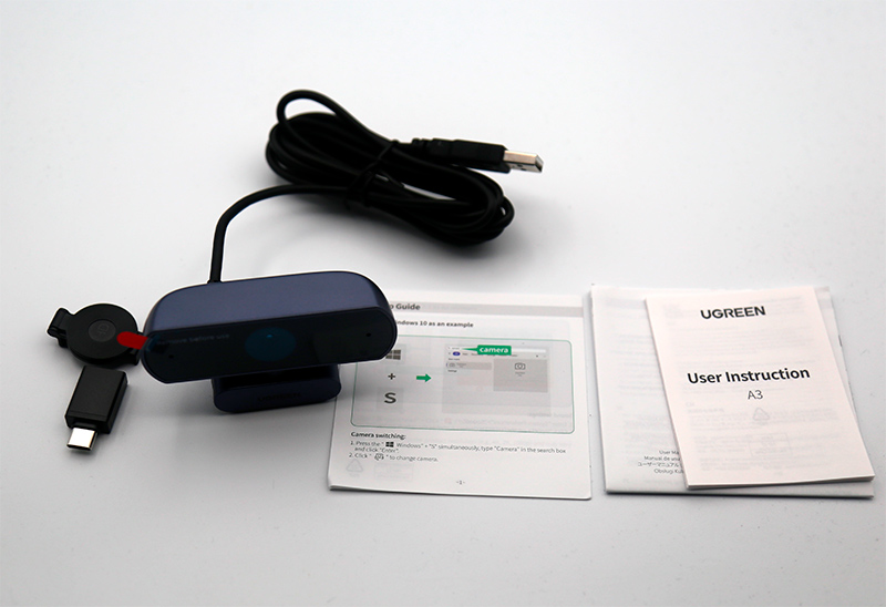 Комплект поставки: камера с кабелем, шторка защиты, переходник USB-A - Type-C, руководство пользователя. За переходник - большое спасибо, для подключения к ноутбуку очень даже пригодится.