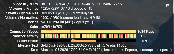 Тот же ролик через европейский сервер hidemy.name. И вот тут уже беда: 4K не идет категорически: постоянно зависает и пытается подгрузить нужный кусок, периодически YouTube сам сбрасывает качество с 4K на 720p - так хоть он более или менее показывается.