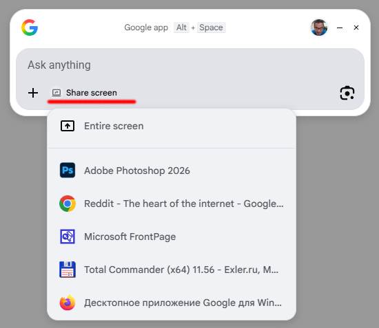 Screen Share - это такой следующий шаг после Lens. Вы делитесь с приложением (а точнее со встроенным туда Gemini)  не статичным прямоугольником, а живым окном или всем экраном, и ведёте диалог о происходящем. Gemini видит то же, что и вы, и отвечает в реальном времени