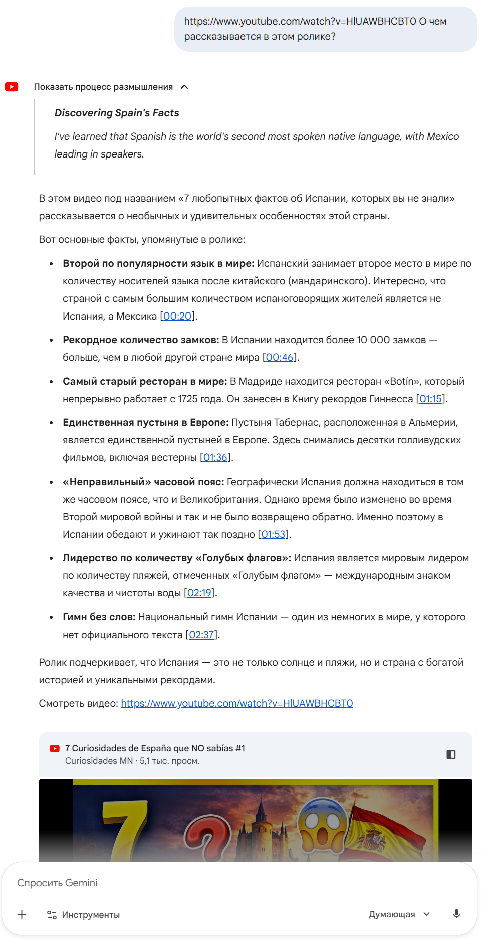 А если в Гемини Про ссылку на видео скорость, что расскажет?