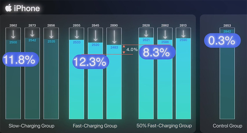 iPhone. Разница между быстрой зарядкой и медленной - всего 0,5% емкости за 500 циклов! Разница между быстрой зарядкой на 95% и быстрой зарядкой на 50% (от 20% до 80%) - 4%. Контрольная группа - такие же айфоны, которые не проходили циклы разряда-заряда.