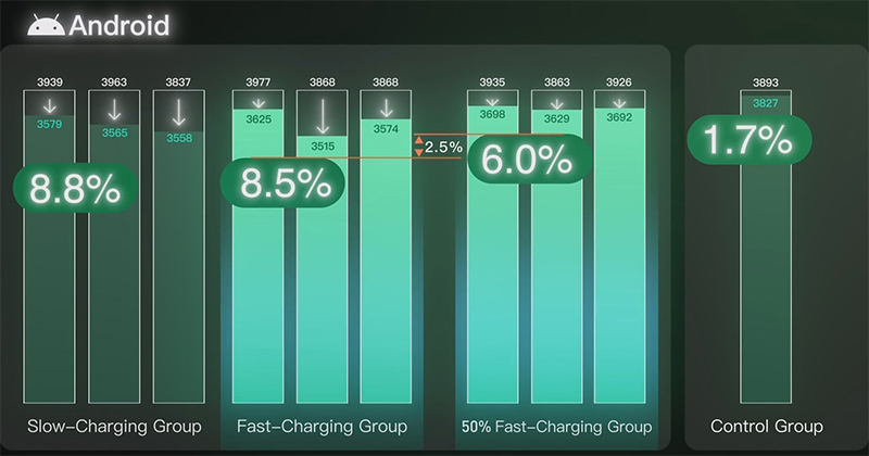 У Android. Разница между медленной и быстрой зарядкой еще меньше - всего 0,3%. Между быстрой зарядкой на 95% и быстрой зарядкой на 50% - только 2,5%.