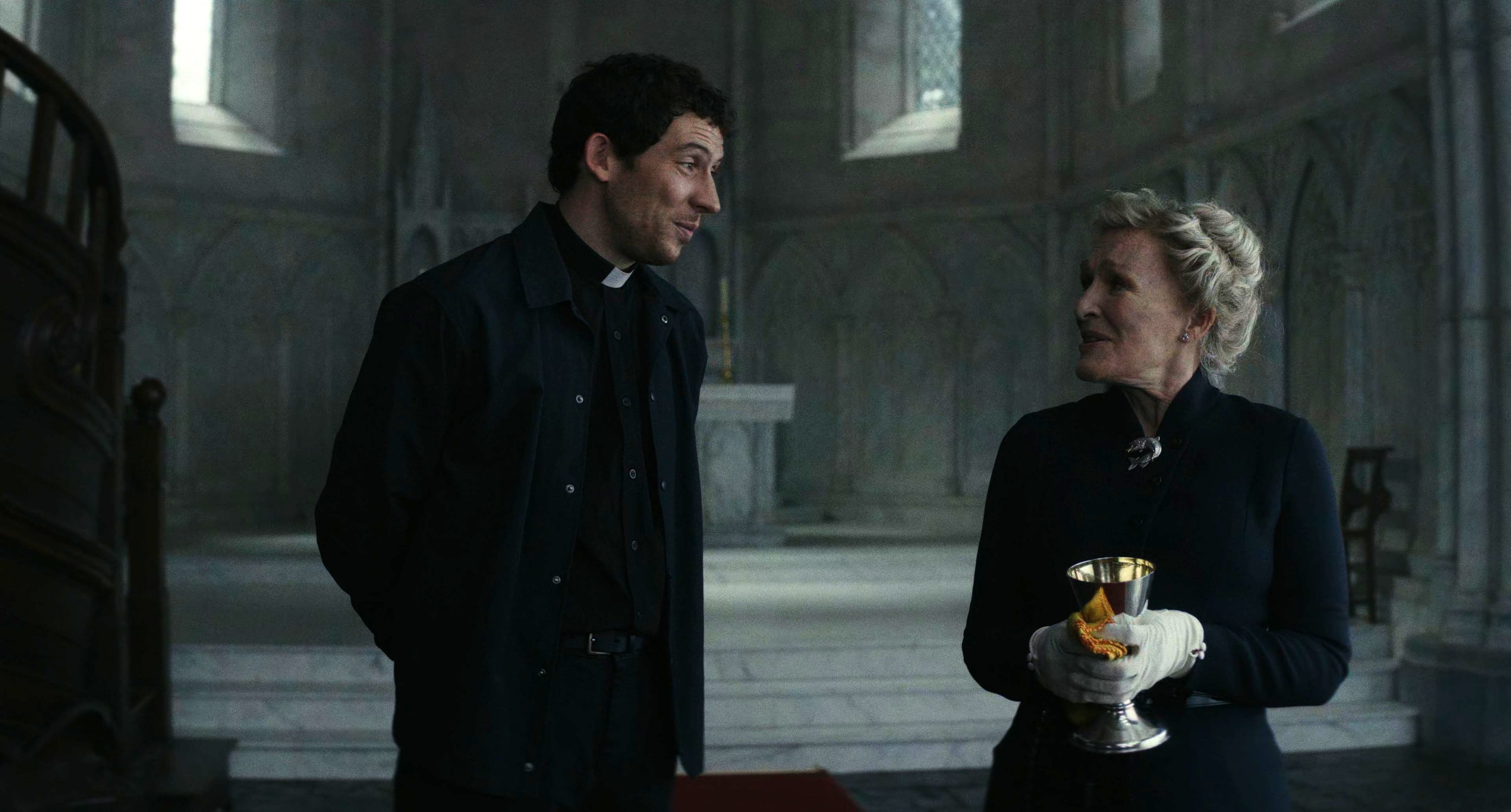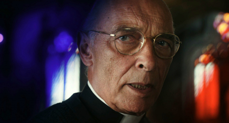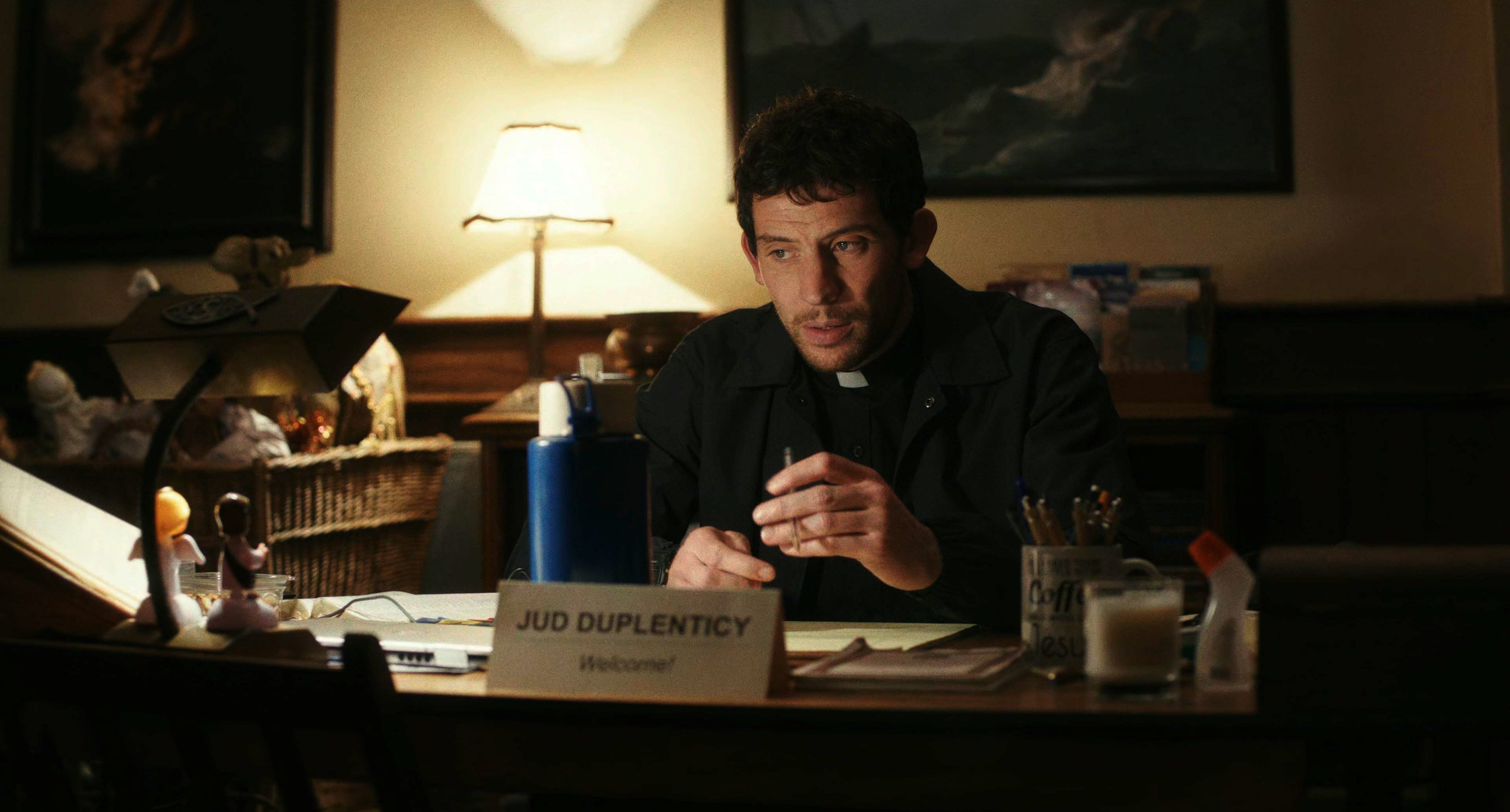 Отец Джад Даплентиси - без сомнений, главный персонаж картины. Он когда-то убил человека на ринге, после чего ударился в религию и изо всех сил замаливает свои грехи. Но этот внутренний зверь в нем время от времени прорывается, и это сыграно здорово. Нам с котом Бубликом не нравится актер Джош О’Коннор еще со времен "Претендентов" (прям по анекдоту - "Ну, не нравишься ты мне"), но нельзя не признать, что Джада он сыграл отлично, и этот персонаж - личность многогранная и непростая. И мы подумали, что с ним вполне возможно было сделать фильм о противостоянии Джада и монсеньора - безо всяких убийств. Потому что это само по себе могло быть интересным.