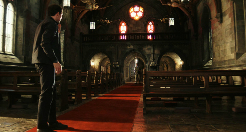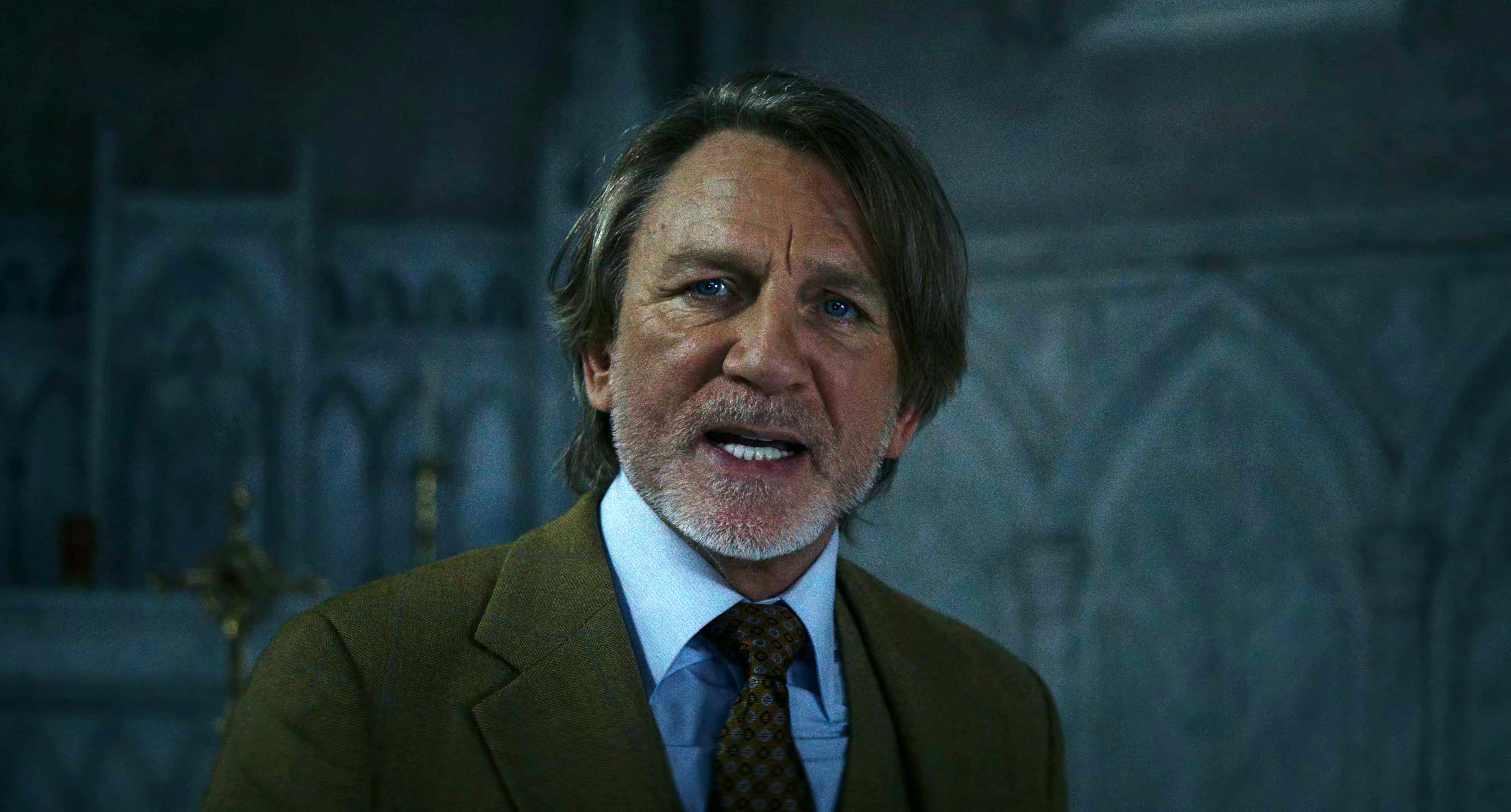 Первые сорок минут здесь идет история Джада и его служения в церкви Божьей Матери Неустанной Стойкости, где проповедует этот слегка (или даже не слегка) бесноватый монсеньор Уикс. И Джад вступает в прямой конфликт с Уиксом, ведь он парень реально боевой. И там челюсти монсеньора явно угрожала большая опасность, но все разрешилось радикальным образом: Уикса таинственно убили, и вот тут-то, ровно на сороковой минуте, в картине возник детектив Бенуа Бланк, слава богу.