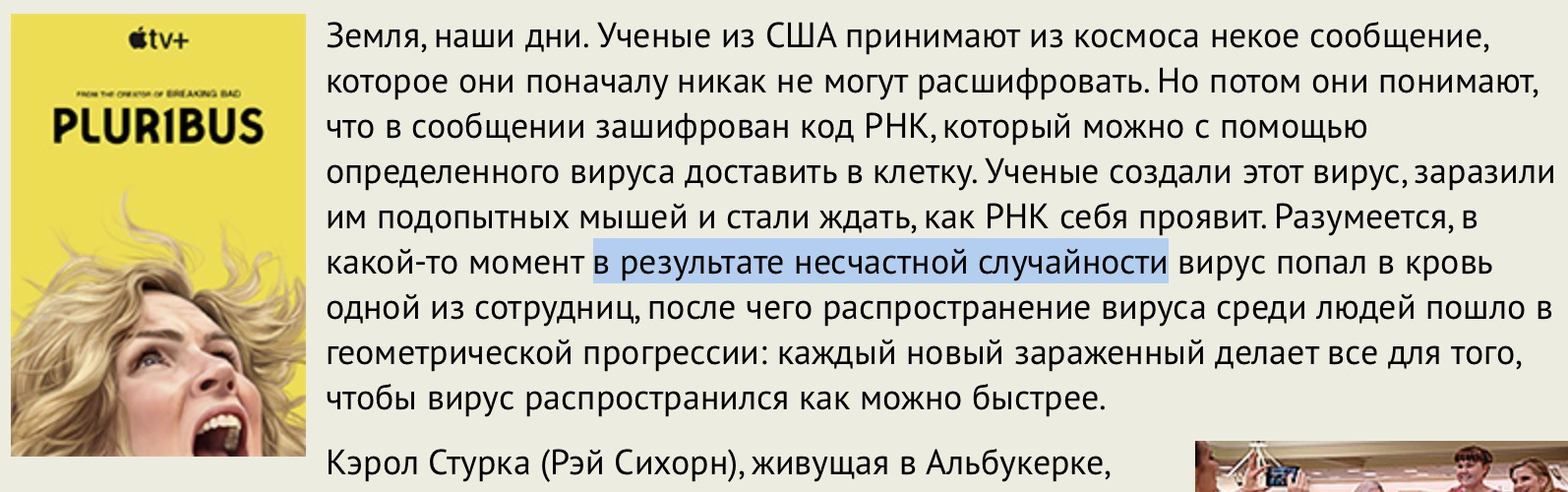 Название для нового сериала, по словам Винса, придумывали долго. Рабочим названием во время съемок было "Wycaro 339", и съемочная команда потом перебрала кучу различных вариантов, среди которых даже был вполне отвратный "Be Kind Re-Mind" (Будьте добры, переделайте сознание). Но в конце концов остановились на варианте "Pluribus" - это отсылка к выражению на латыни "E Pluribus Unum" (из многих единое), которое много лет было девизом США, а потом его заменили на "In God We Trust". Из многих единое - да, это именно то, о чем рассказывается в сериале, а русский вариант названия "Одна из многих" - происходящему в сериале не соответствует, что, впрочем, обычное дело.