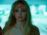 Вполне пристойная актриса Дженнифер Лоуренс (в недавнем фильме "Без обид" она была хороша) с полным самоотречением отдается своей работе в этом фильме: она очень убедительно ползает на четвереньках, размахивает ножом, время от времени расшибает лоб то о торпедо машины, то о какое-нибудь зеркало или стекло, кричит, воет, лает, обнажается и наблюдает за природой.