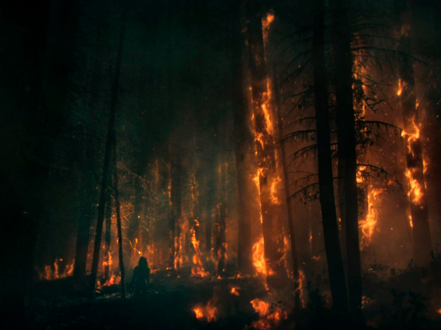 Но потом ее показывают в сарафане на пороге их дома, а горящего леса нигде не видно.